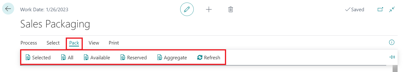 The items that have been assigned to a sales order are packaged from the Sales Packaging page. You create a new package record by clicking the Home tab and selecting one of the options in the Pack group:
