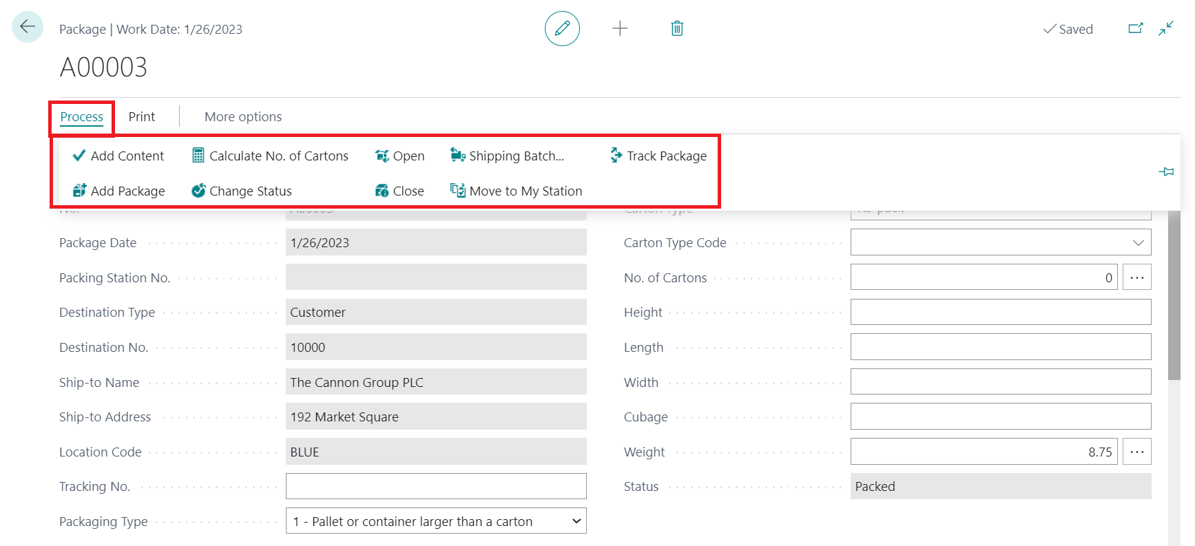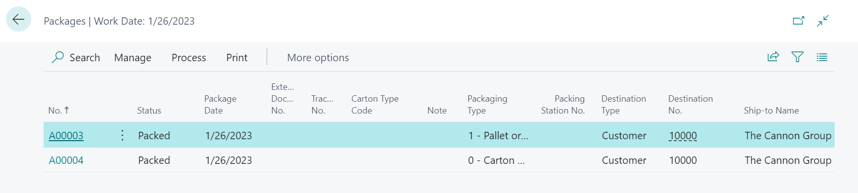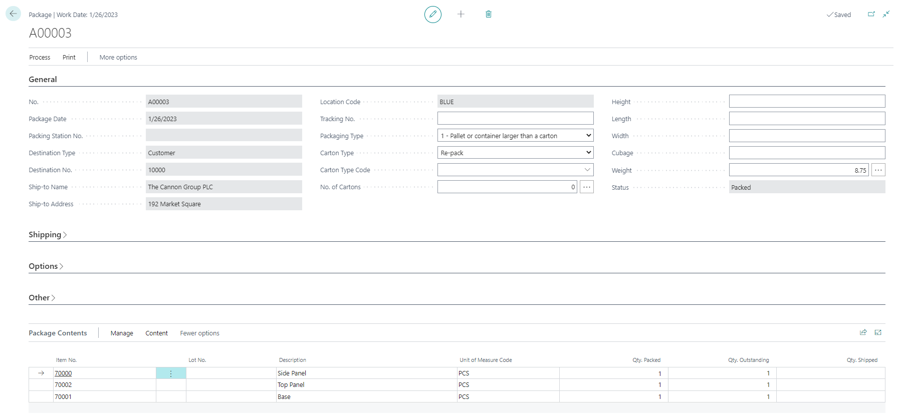 - Packed: The package has been fully packed and cannot accept additional contents. New package records are automatically assigned a status of Packed, but this value can be manually changed, if desired.