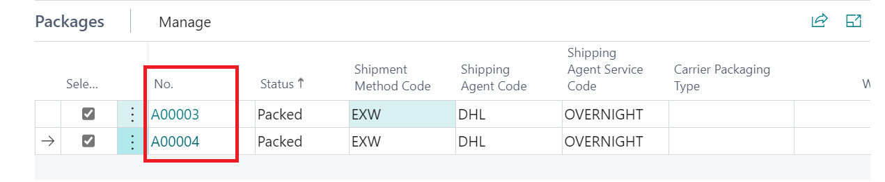 After creating a package in the Sales Packaging page, you can open the package’s card by clicking the value in the No. field on the appropriate package line.