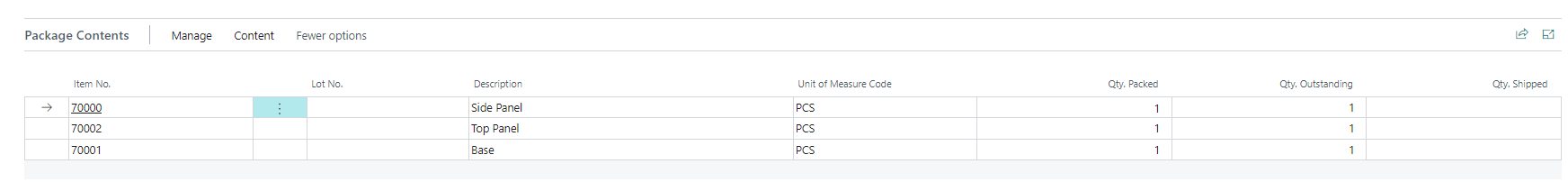 The No. of Cartons field on the General FastTab displays the quantity of other packages that are contained within the currently opened one. This is useful if the package record was created through the aggregation of other package records, as it provides visibility to the packages within it. For example, if we aggregate 3 cartons into a single pallet, the No. of Cartons field for the pallet’s package record would be a value of 3. You can click the AssistButton to the right of this field to view the Package Cartons page, which lists each carton’s contents. It is also possible to manually create carton records on this page.