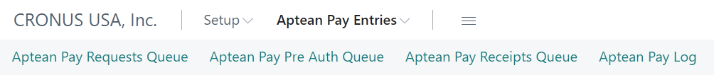 You can navigate to the Aptean Pay Requests Queue, Aptean Pay Receipts Queue, Aptean Pay Pre-Auth Queue and Aptean Pay Log page by following this process:
