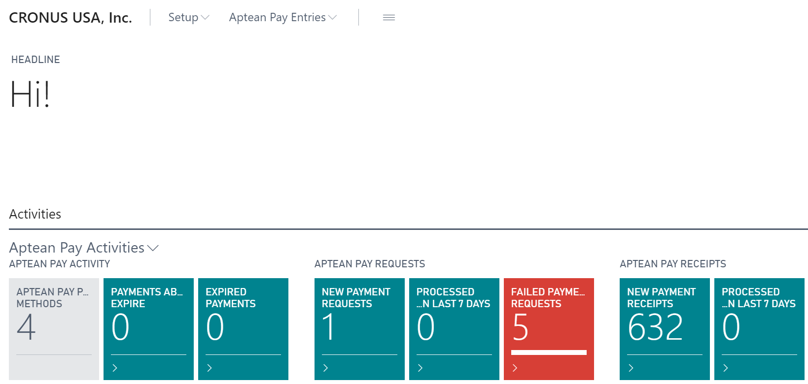 - Aptean Pay Payment Methods: This shows count of created Aptean Pay Payment Methods.
